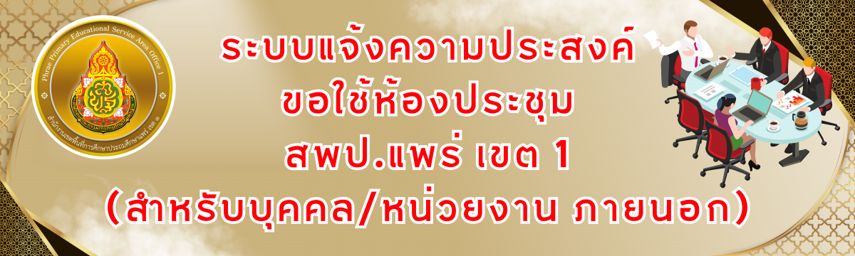 ช่องทางอิเล็กทรอนิกส์ สำหรับผู้รับบริการ ยื่นคำขอเข้าใช้บริการ e-Service การขอใช้ห้องประชุมสังกัดสำนักงานเขตพื้นที่การศึกษาประถมศึกษาแพร่ เขต 1 ผ่านช่องทางอิเล็กทรอนิกส์ Website สพป.แพร่ เขต 1